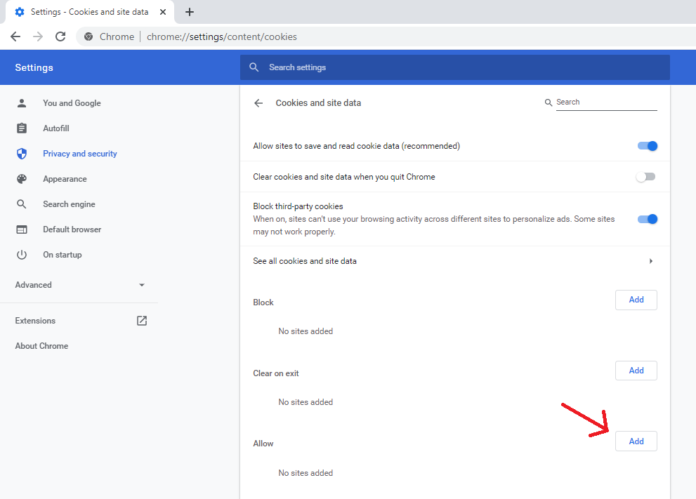 Open a new tab and navigate to chrome://settings/content/cookies. You should see a page that looks like the below image. Note the red arrow, we will be clicking that next.