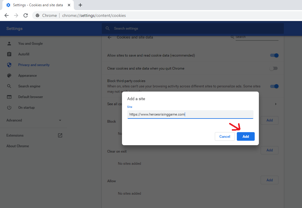 Click the "Add" button as indicated in the above screenshot. Type in exactly https://www.heroesrisinggame.com and click the "Add" button.